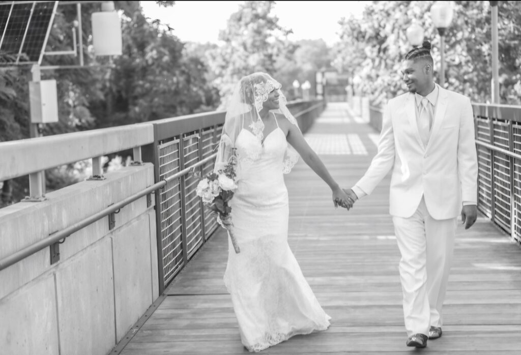 Stunning portrait of a bride in white dress, showcasing elegance and reflection during golden hour.